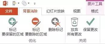 当PPT进入“背景消除”状态的时候,工具栏会出现2个重要的功能:“标记要保留的区域”和“标记要删除的区域”:
