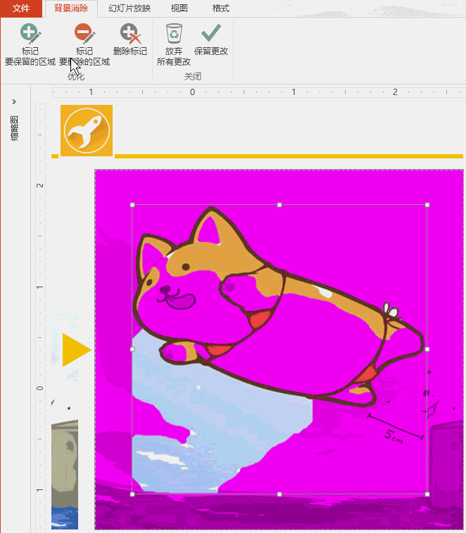 点击“删除背景”这个按钮之后,PPT就会进入一个图片“背景消除”状态,开始帮助你删除背景。这时候你看到的图形界面应该是下面这样的,所有紫红色的区域都会被清除掉: