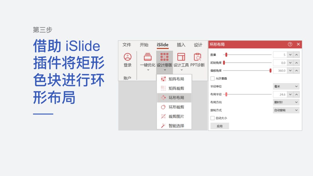 第三步 借用 iSlide 插件,将矩形色块进行环形分布: