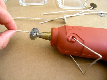 将罐子放在平坦的表面上,在那里它们可以停留几个小时,因为一旦倒入蜡,你不想移动罐子。首先将灯芯底部热粘合到罐子底部。