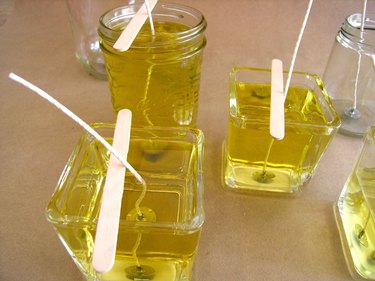 一旦蜡完全融化,小心地倒入容器中。使用工艺棒将灯芯支撑在中心,这样灯芯就不会被蜡完全掩埋。