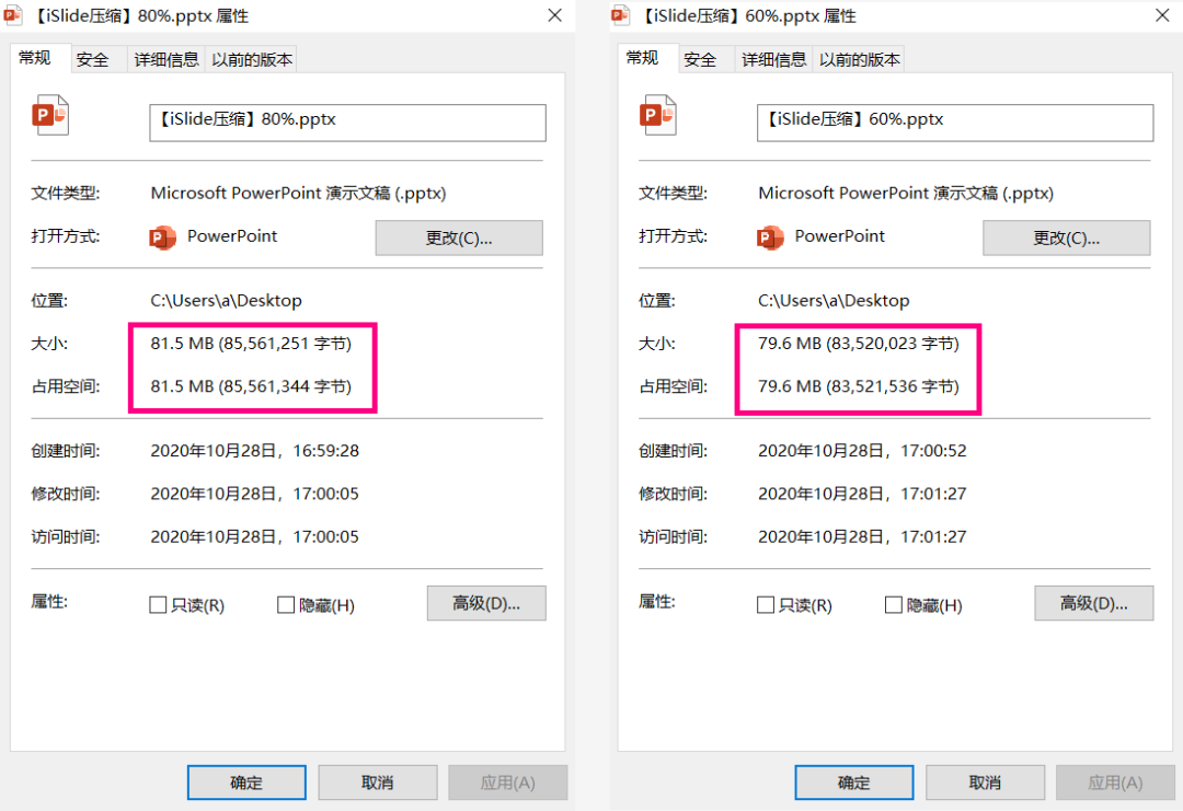 看看对比,因为示例的这份PPT图片比较多,我们勾选完后,再选择图片高保真,整份PPT已经压缩到了128M,足足少了45M。