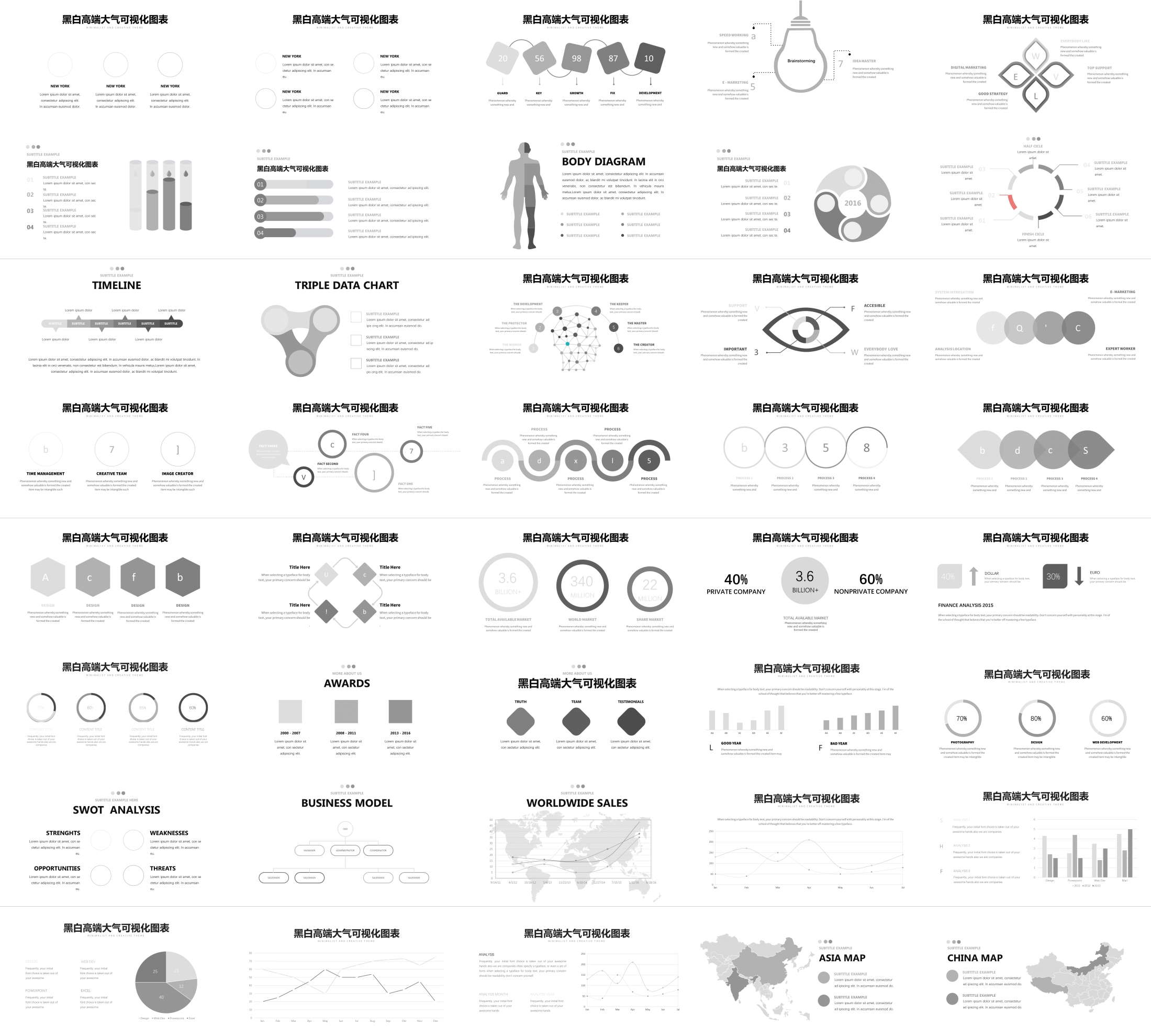 简约风是大部分人的最爱,这些黑白图表有一个很大的好处,就是职场中的各位可以根据自己喜欢的颜色,直接修改,非常方便,里面的数据展示也非常全。
