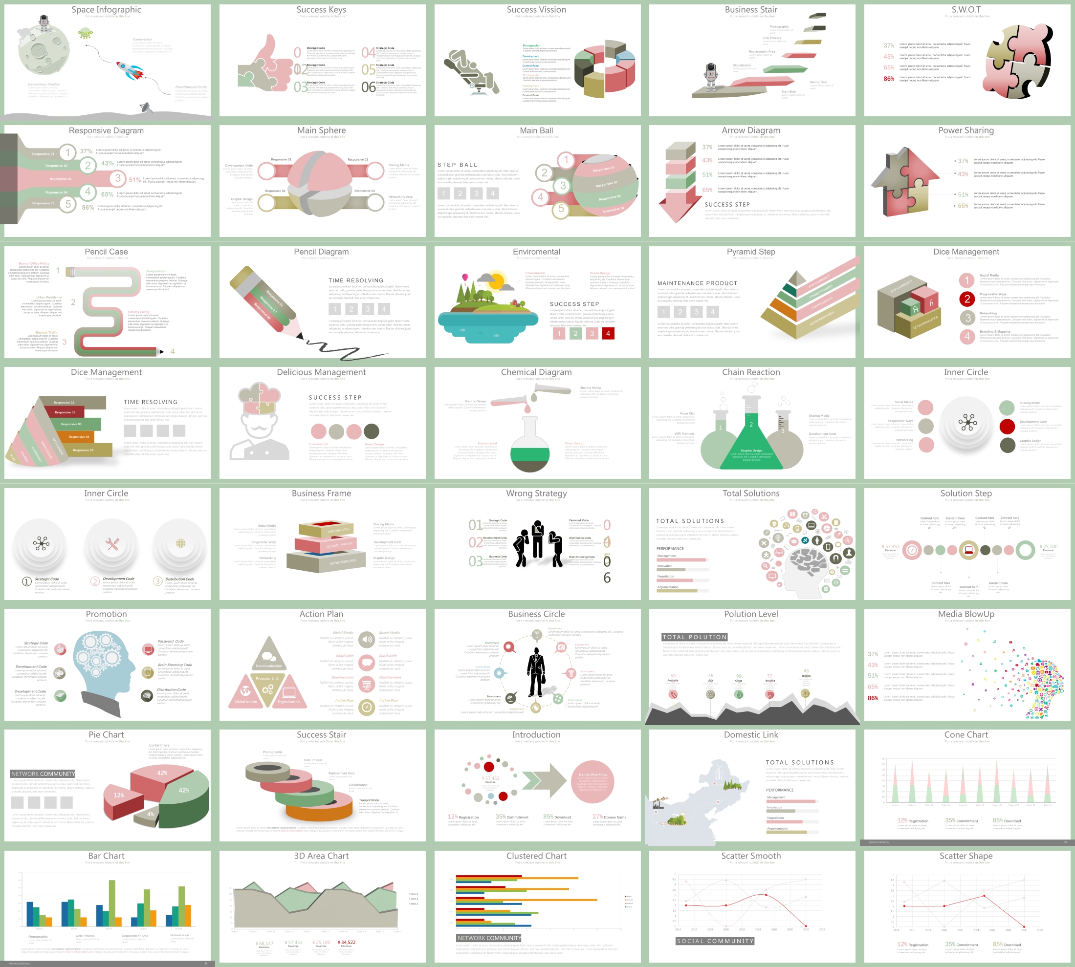 图表风格非常具有创意,鲜明的颜色让整体风格显得非常活泼,组合性的PPT较多,让你的职业演讲会变得更加个性。