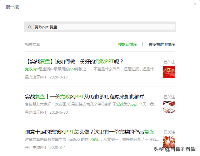 除此之外,很多公众号会整理党政 PPT 的模板、素材、成品,可以直接搜索下载。