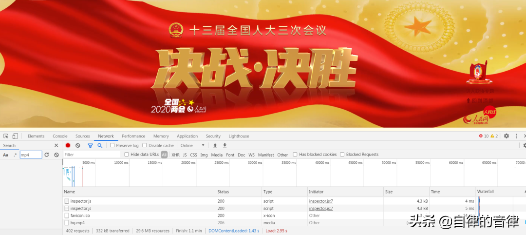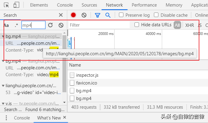 选择 “Network”,之后在左上角进行搜索即可,比如搜索“mp4”查找页面中的视频素材。