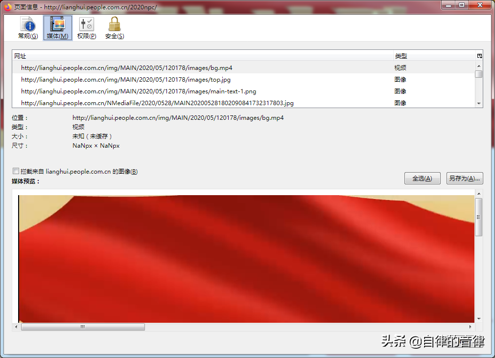 我们在火狐浏览器中,依次点击菜单栏选项“工具-页面信息-媒体”,会出现这样的界面: