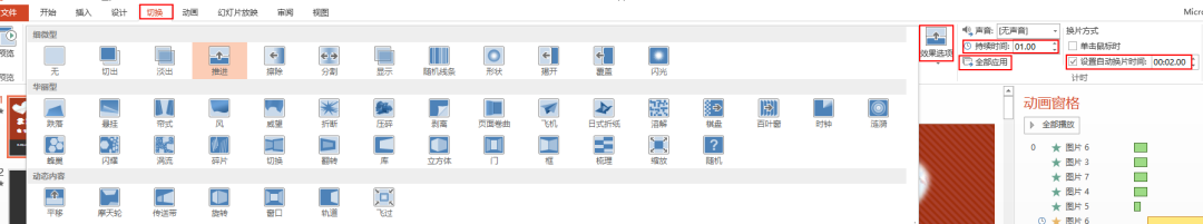 【换片方式】设置为自动换片,设定【持续时间】,【效果选项】可设置方向,最后按【全部应用】。
