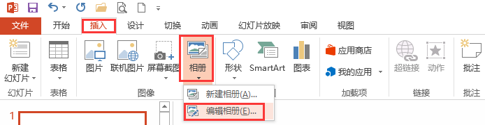 如果想再打开“相册”对话框进行更改,可切换到【普通视图】,单击“插入/相册/编辑相册”: