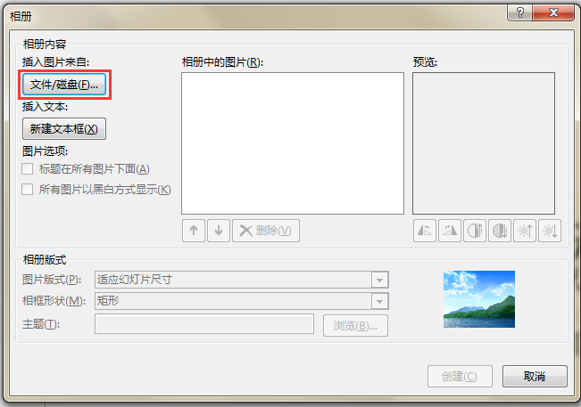 在打开的“相册”对话框中单击【文件/磁盘】: