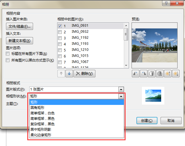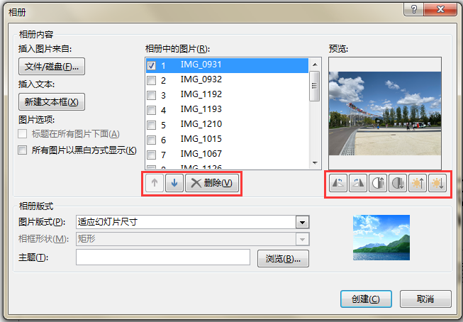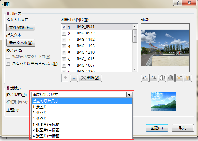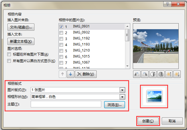 主题在此不用选择,创建相册后在PPT页面中选择主题,更方便查看。
