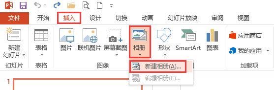 首先,在PPT中,单击“插入/相册/新建相册”: