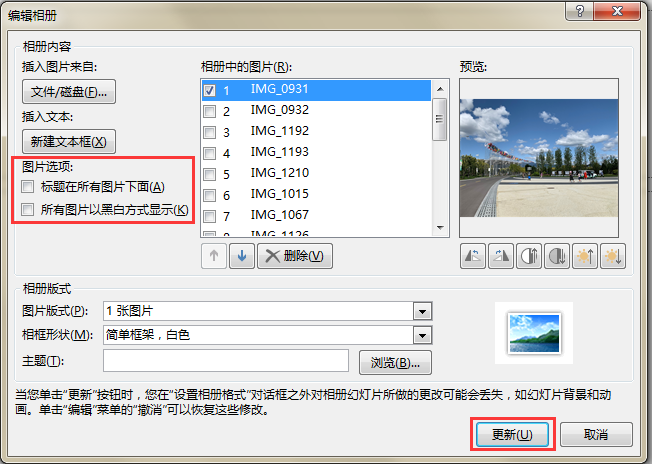 这种效果如果我们不喜欢,那就再次打开【编辑相册】,去掉【图片选项】中的两项对勾,按【更新】,照片又恢复如初。