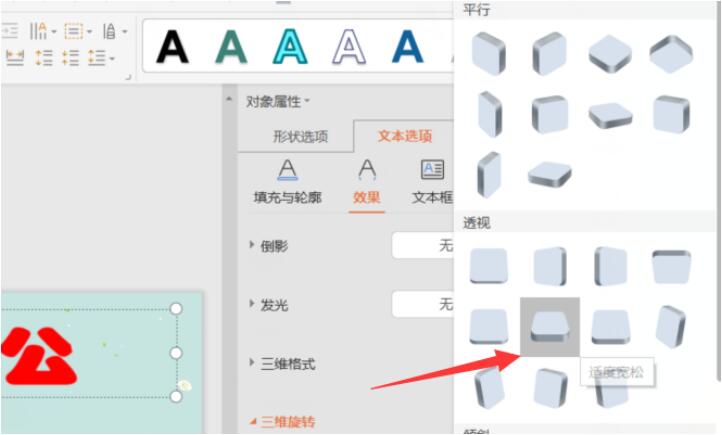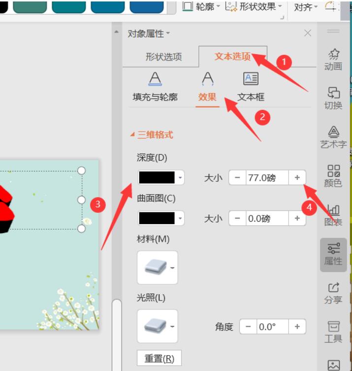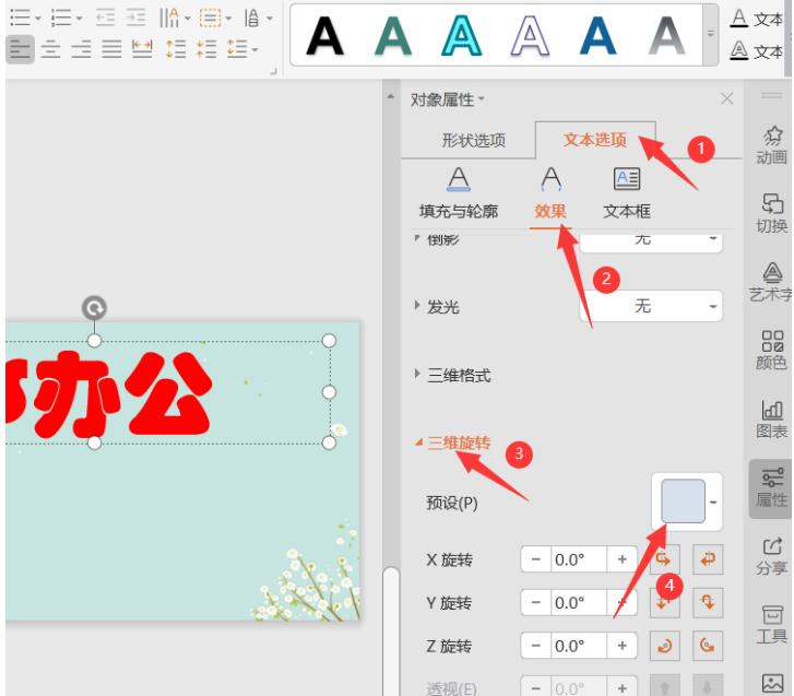 2.首先我们打开PPT,然后插入文本框,具体操作如下图所示:然后输入我们想要改成为三D立体图形的文字,并调节字体和大小颜色等:然后选中字体在文本框上双击,具体操作如下图所示:然后PPT右边会出来一个对象属性的工具框,我们点击形文本选项,在下方效果菜单中点击三维旋转:然后设置一种透视的样式:然后再点击三位格式,调整深度颜色和大小:这样3D字体就制作完成啦: