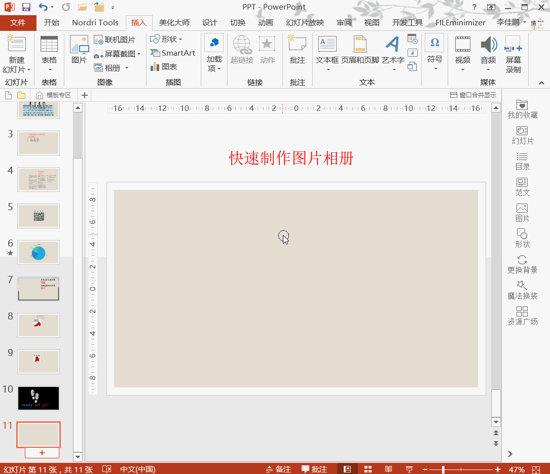 插入——图像中的相册——新建——文件——选择想要插入的图片文件——插入——勾选图片复选框可以激活调整按钮,对图片小显示效果进行调整——选择主题确认即可。