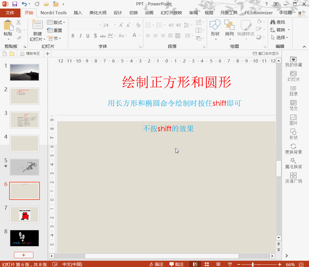 插入——形状——选择长方形/椭圆——按住shift键用鼠标绘制即可得到正方形/圆形(如果不按shift键得到的是长方形和椭圆形)