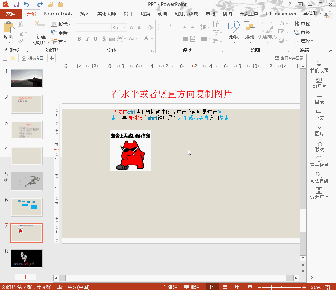 点选图片——同时按住shift和ctrl键,用鼠标拖动图片——可以实现水平或者竖直方向复制图片——(只按住ctrl键然后用鼠标拖动时是任意复制该图片)