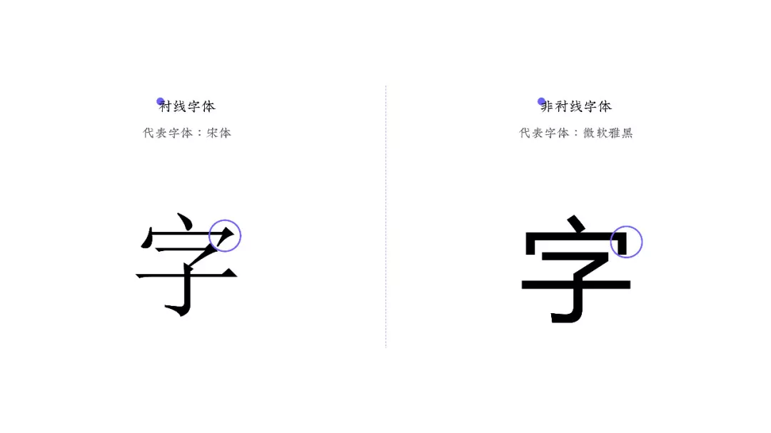 衬线字体以宋体为代表,其特征为“字”的笔画开始和结束的地方有额外的装饰,并且笔画的粗细会有所不同;