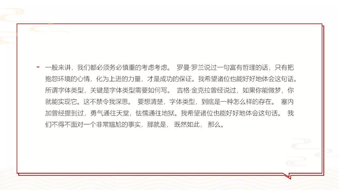 对于新手来说,最好在一页幻灯片里面保持一种字体,保持页面整体的统一性。