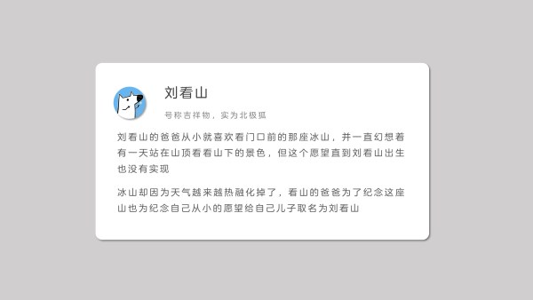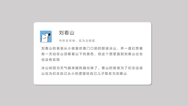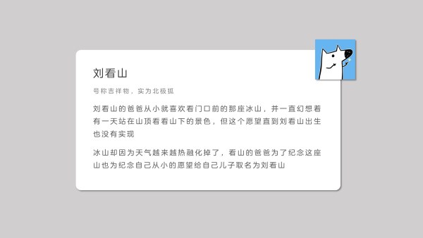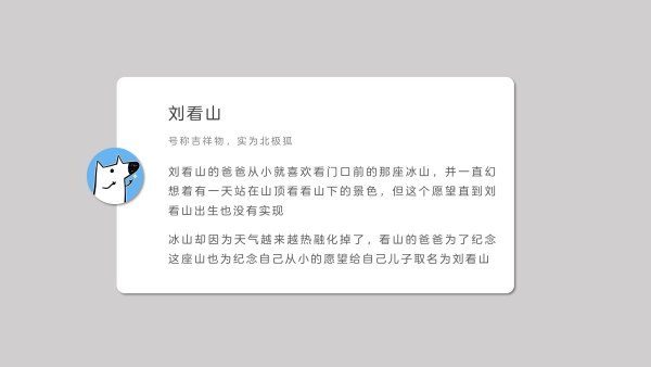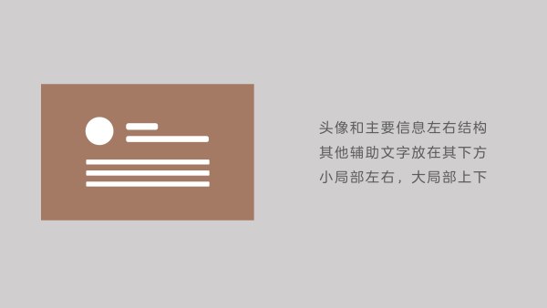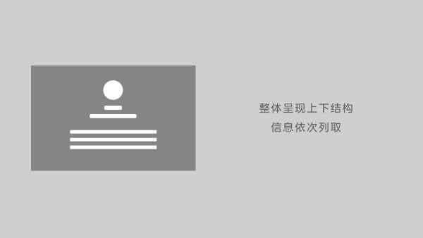 头像和主要信息呈上下结构,其他的辅助说明信息放在其右侧,形成在大布局上为左右结构。