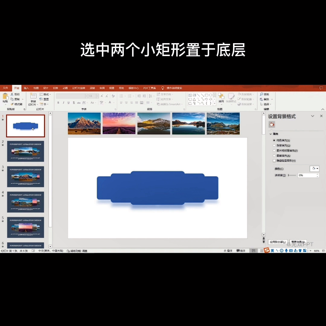 4.将幻灯片复制四份,复制准备好的图片,选中大矩形右键设置形状格式,点击图片或纹理填充剪贴板,同上操作复制图片剪贴板,按顺时针更换后面矩形,全部更换好后按住Shift键全选幻灯片,右键设置背景格式改深蓝,然后给每张幻灯片插入文字,按住Shift键全选所有幻灯片,添加平滑切换效果。