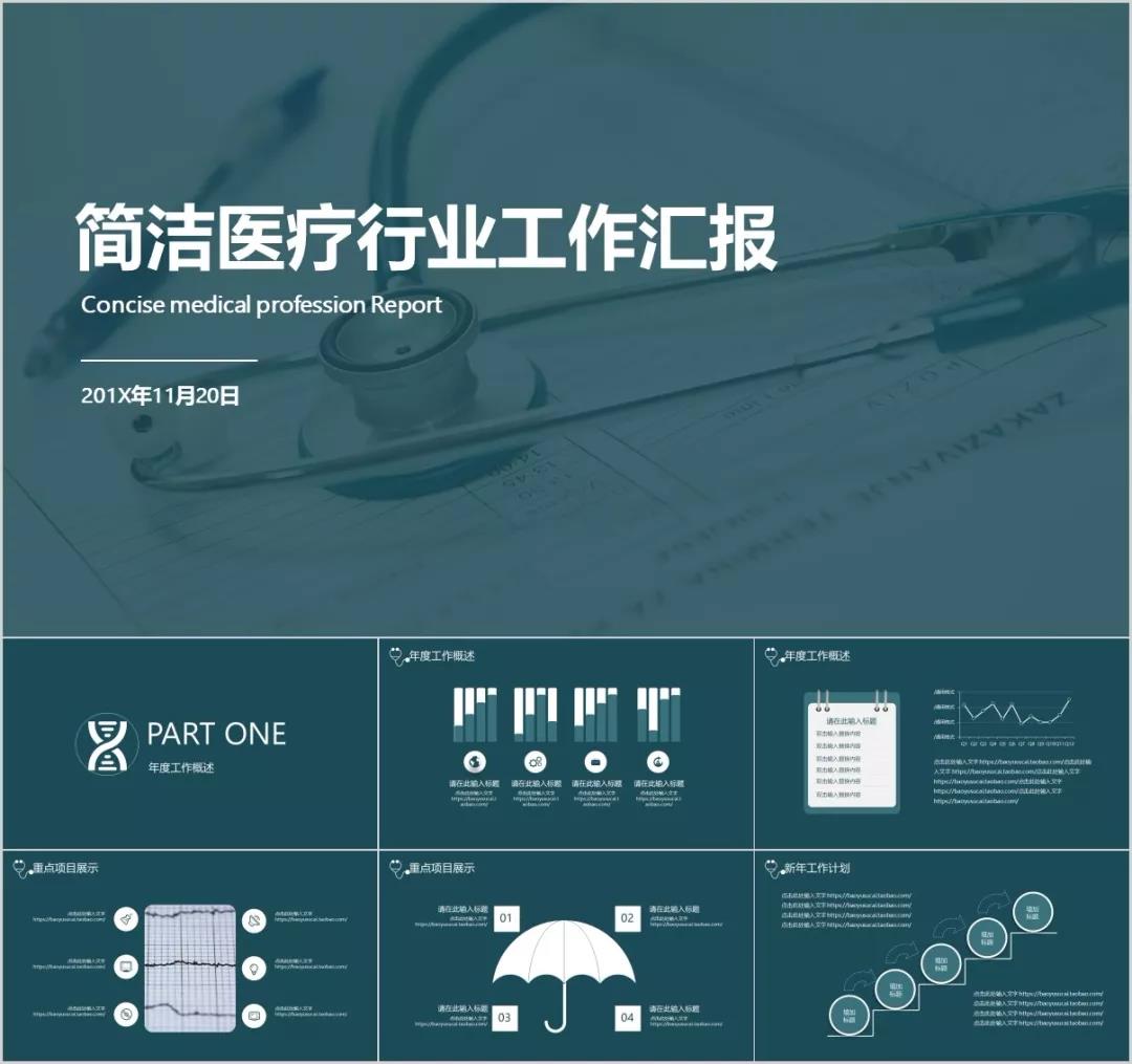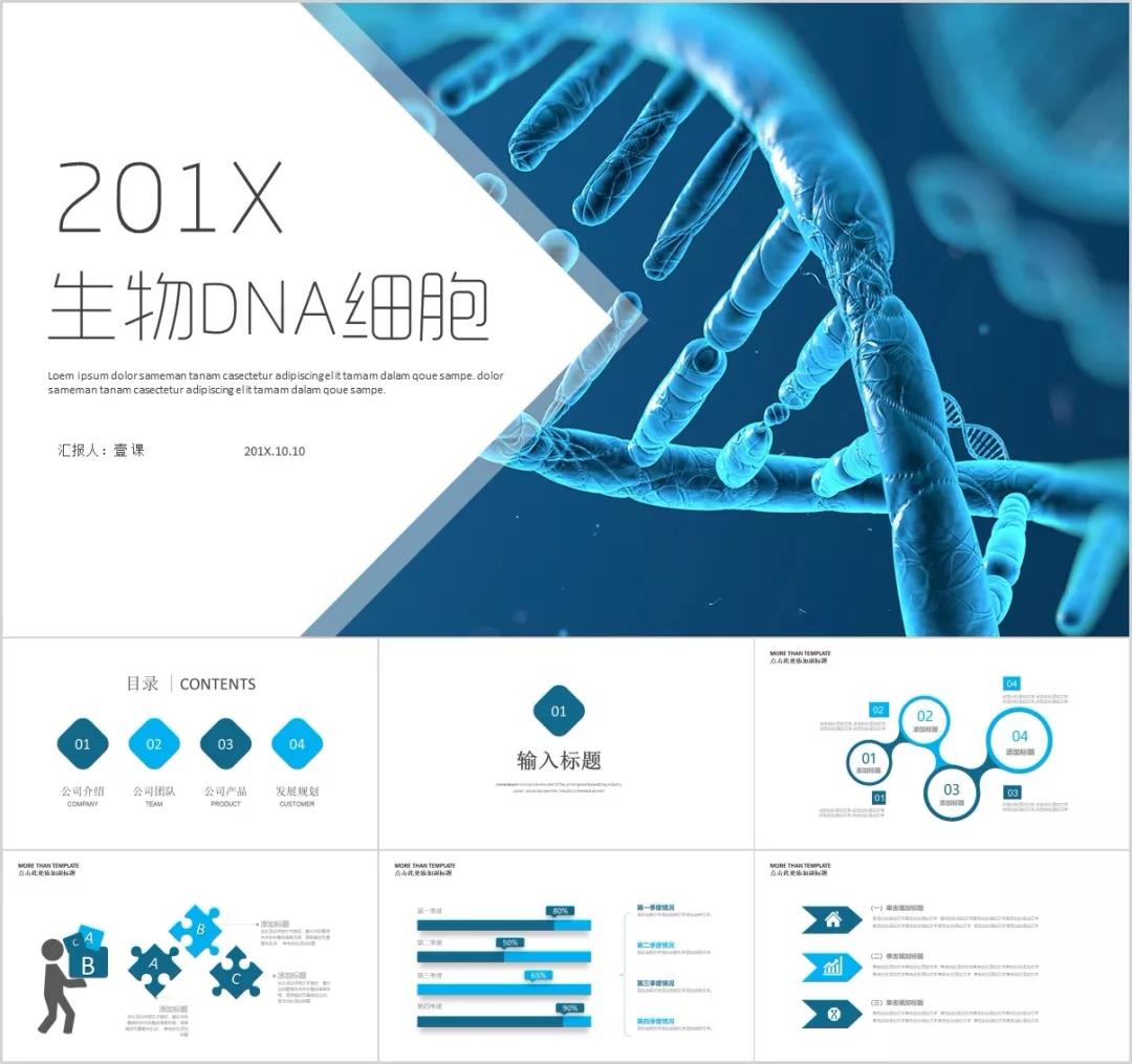 3.这套PPT的设计包含了很多的医学元素,例如:听诊器,DNA双螺旋等,主色以白色做基础,配合沉稳的蓝色,更给人一种庄严神圣的感觉。