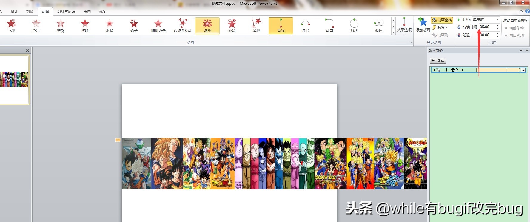 选中动画导航栏,然后在计时中,把持续时间设置为”05.00“,以此来控制照片滚动的速度,或者在计时选项卡中事先把期间设置为非常慢。