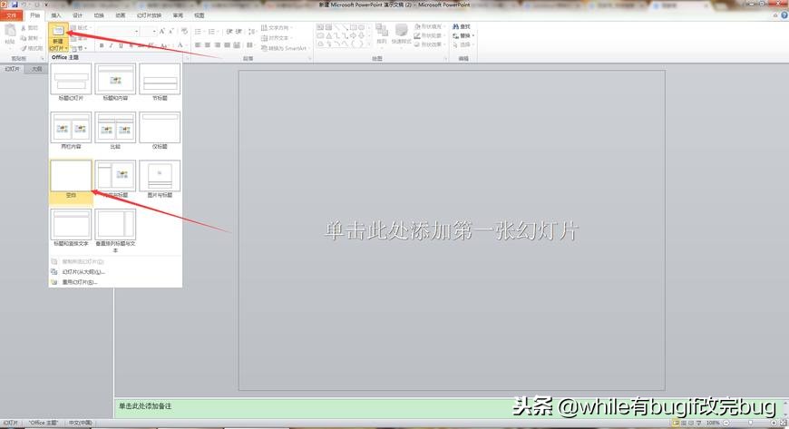 然后点击新建一个幻灯片,并选中空白的幻灯片