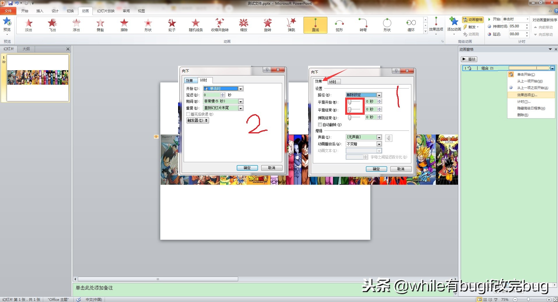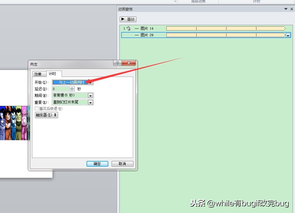 设置好动画动作之后用鼠标将红色的小箭头由指向下方改为指向左方,并将动画属性给设置好;打开“效果”对话框,将“平滑开始”和“平滑结束”均设置为“0”,然后选择“计时”选项卡,在“开始”下拉列表中选择“与上一动画同时”选项,在”重复“下拉列表中选择”直到幻灯片末尾“选项,单击”确定“按钮。