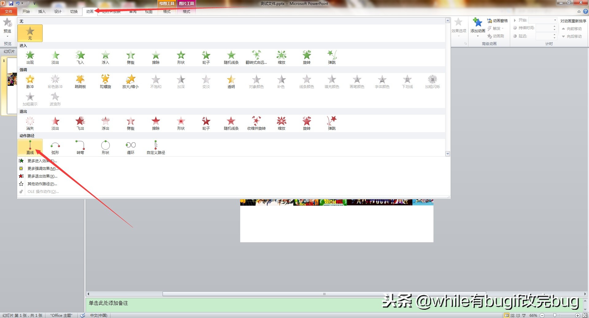 将图片编组插入之后,就是我们的设置动画效果的步骤了,选中上方的动画导航栏,然后选中直线动作;