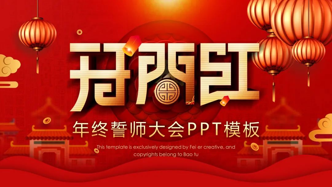 3.年会PPT一般采用红色等喜庆颜色,代表新年的欢喜气氛,对于PPT的封面页,通常使用醒目大字,让整个PPT和节日大气隆重相互呼应