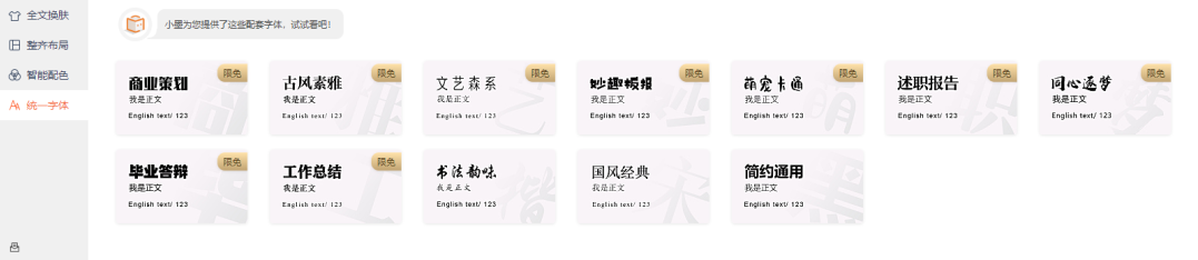 全文美化的四个功能中,不仅仅为大家提供了丰富的模板与布局,还为“细节控”们提供了【统一字体】的功能: