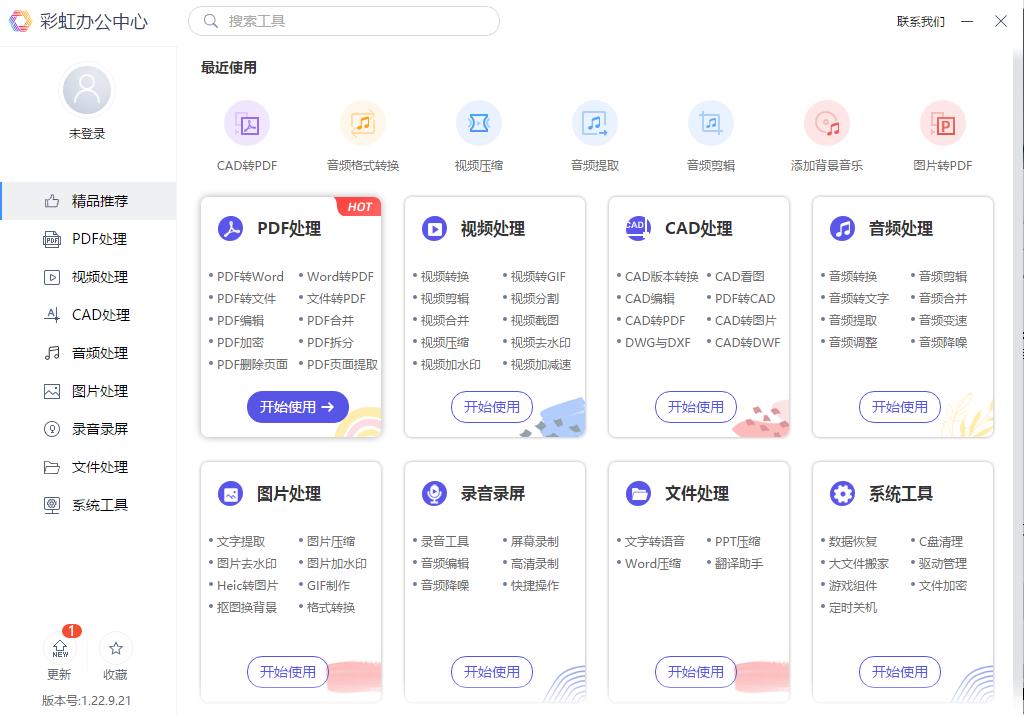 彩虹办公中心这款软件支持的功能种类有很多,都是免费使用的,包含的功能有PDF、图片、视频、CAD、音频等等功能的处理。可以快速的将PDF文件转换为常用到的格式,支持批量快速进行转换的操作,大大提升转换的效率。