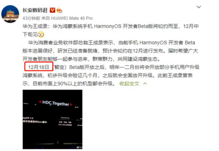 就在近日,有知名大V爆料,华为鸿蒙OS系统的Bate版本年将会在12月18日正式开放,在2021年1月、2月份,开放部分华为手机用户升级渠道,在经过几个月验证后,才会全面开放升级,这意味着最快40天过后,华为手机用户,就可以率先体验到华为鸿蒙OS系统了,但这个体验是需要自己刷入Bate版本鸿蒙系统,并不是华为官方所提供的正式版系统;