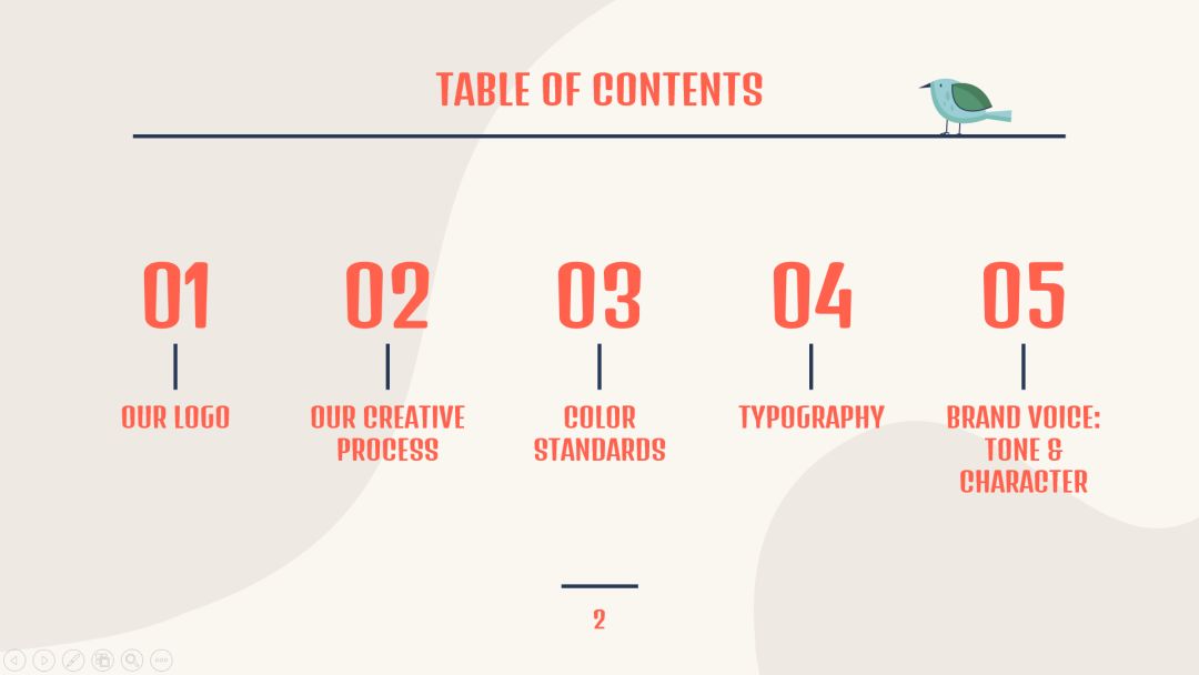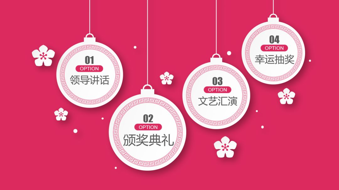 整体颜色的一致性,这个不必多说。每页细节的元素是什么呢?首先是微立体风格,其次是点缀的小花朵。如下面的目录页、过渡页、正文页等等: