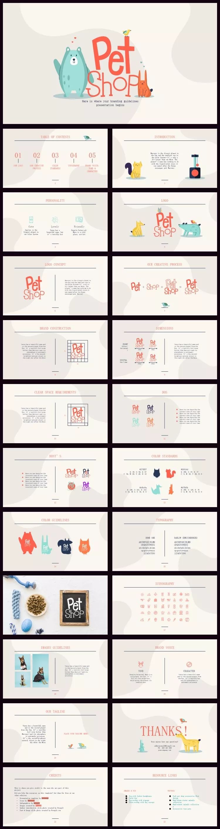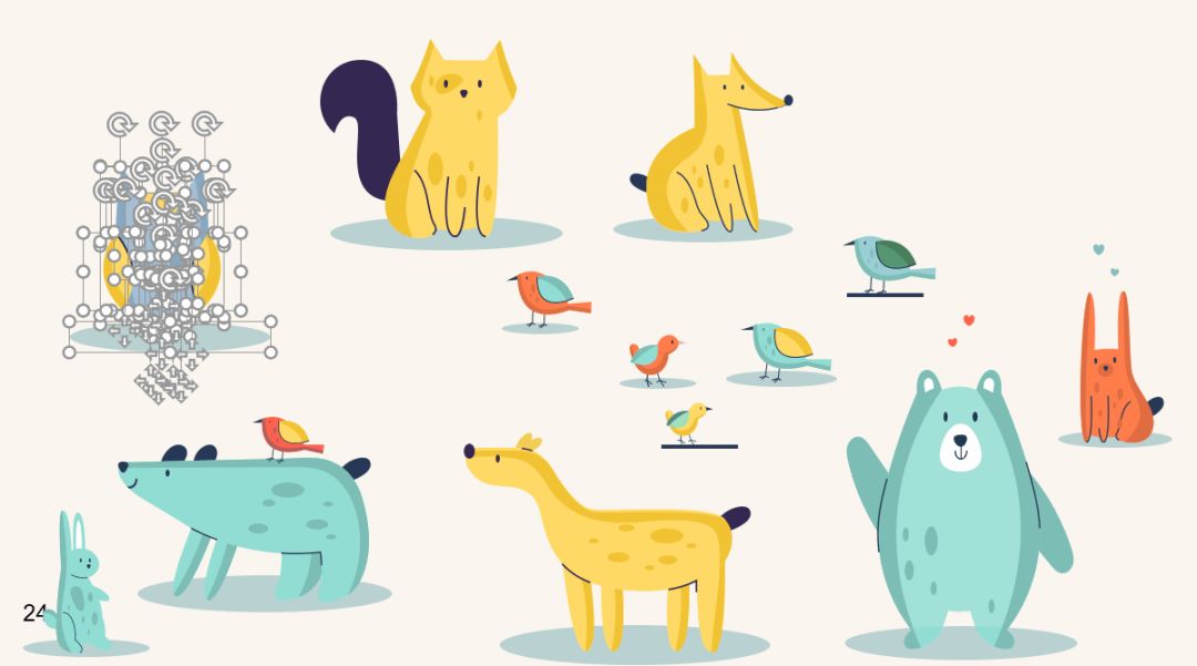 首先,该作品采用了一组风格一致的动物插画,如下图,且这些插画的颜色都保持在PPT整体的配色范围之内。
