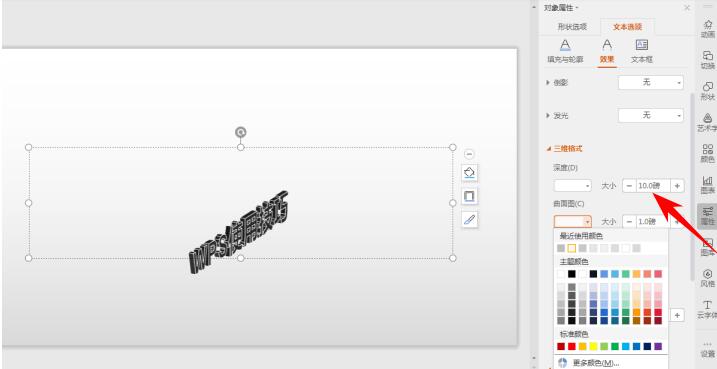 2.首先,在PPT幻灯片当中输入文字,选中后单击右键,选择【设置对象格式】,如下图所示:弹出【对象属性】的对话框,单击【文本选项】,选择【效果】选项,如下图所示:选择【三维旋转】,在预设的下拉菜单下选择【离轴2右】:然后选择【三维格式】,将深度的大小设置为10磅,然后将曲面图的颜色设置为白色,如下图所示:设置完毕后,可以根据立体面调整字体的深度,在这里调节至18磅,立体效果如下图所示: