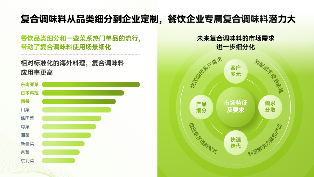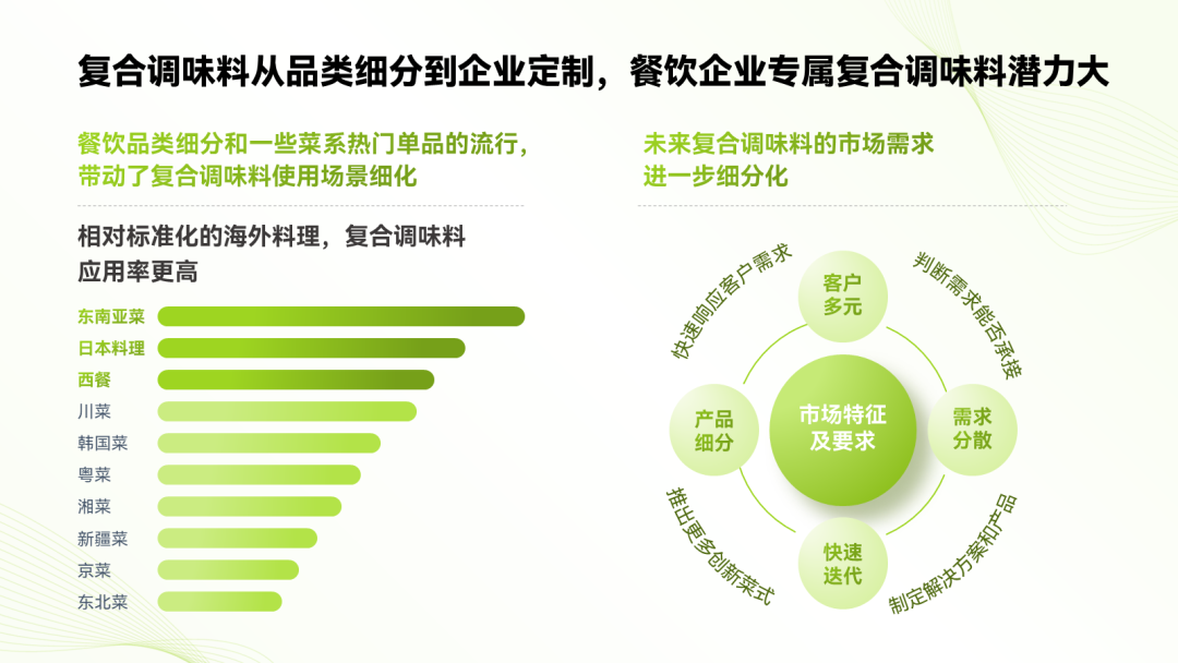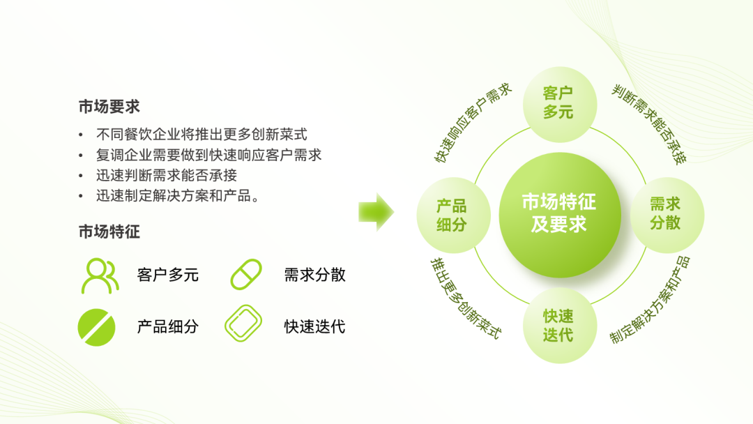 比如,这里我就把“市场特征”跟“市场要求”糅进了一个环绕型的图表里: