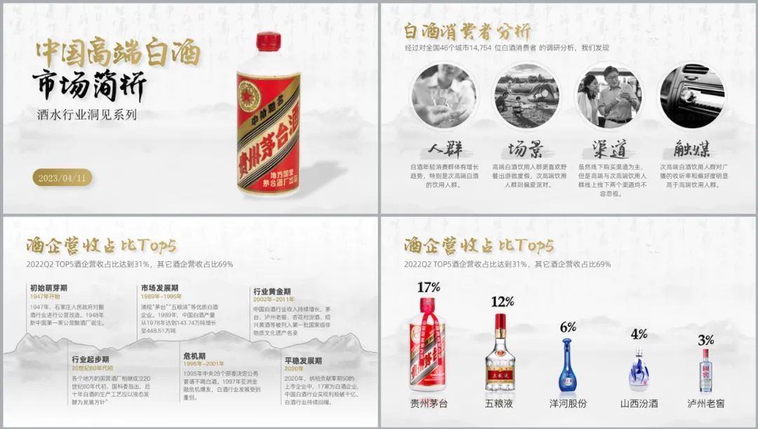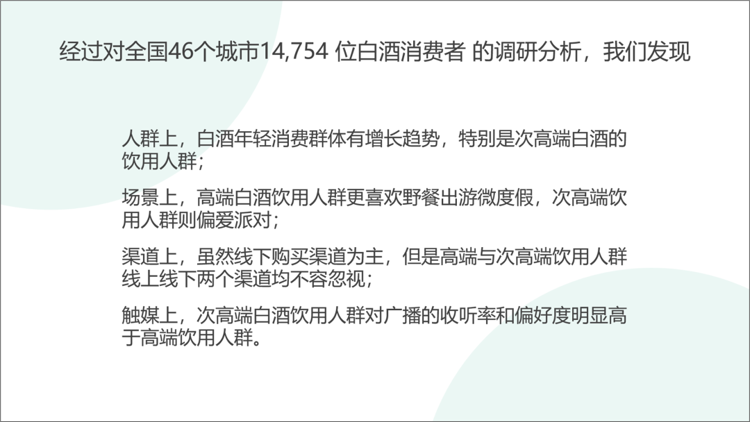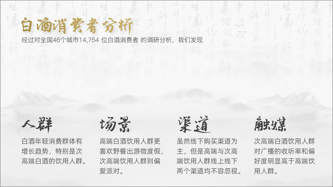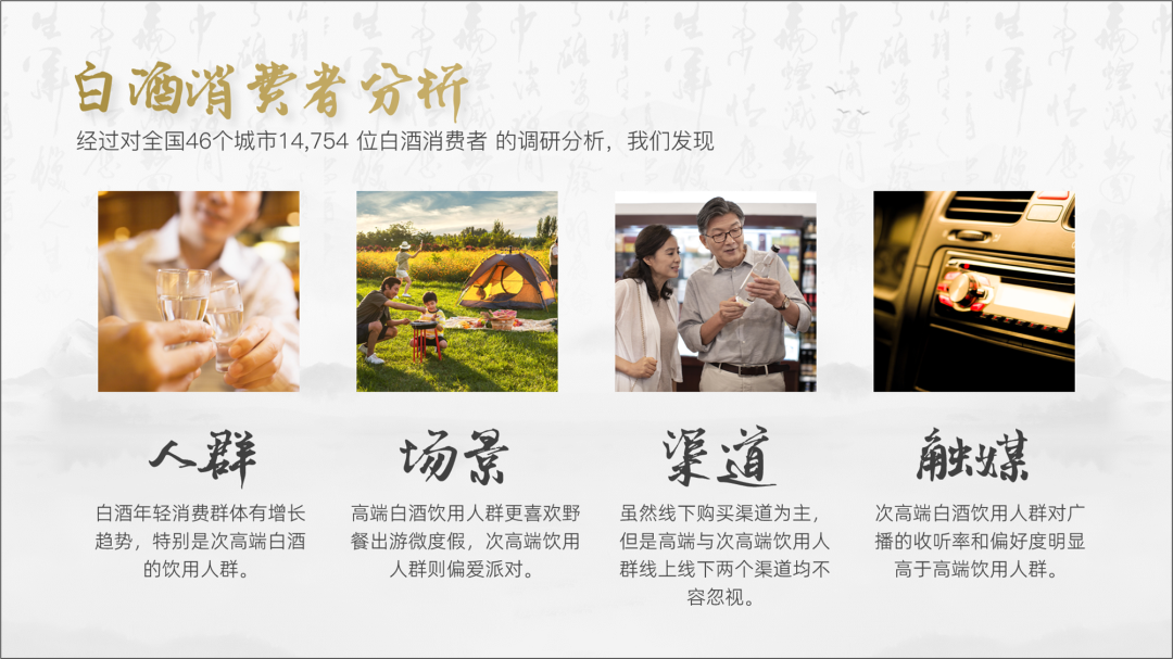 很明显,这一页PPT有四个部分,从四个角度来说明白酒消费者。