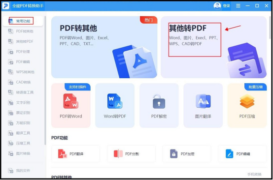 第一步:首先打开全能PDF转换助手界面,在常用功能中点【其他转PDF】进行转换。
