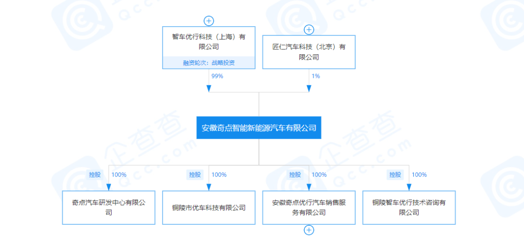 连线出行通过查看奇点汽车股权穿透信息,可知铜陵产业发展基金已完全退出,智车优行科技目前已持有奇点汽车99%的股权。