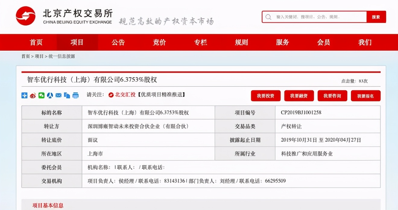 2019年10月底,北京产权交易所披露了一份公告,公告显示深圳博雍智动未来投资合伙企业(有限合伙)(以下简称“博雍智动”)计划转让智车优行科技的6.3753%股权。