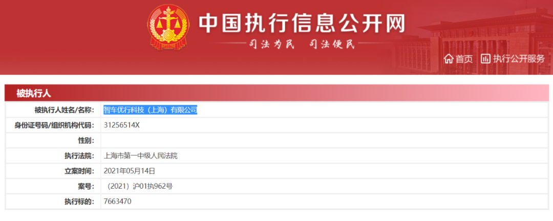 根据中国执行信息公开网数据,上月14日智车优行科技(上海)有限公司被上海市第一中级人民法院列为被执行人,执行标的为7663470元。