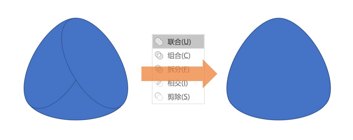 将三个椭圆如下左图放置在一起,然后使用【合并形状-联合】将它们变为一个整体,粽子的主体形状便完成了(放置的时候注意保证形状边缘过渡流畅):