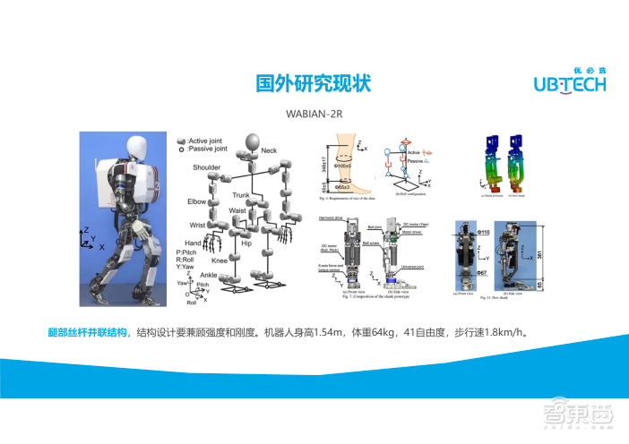 上图展示的是早稻田大学的WABIAN-2R机器人,这个机器人特点在于整个腿部除了正常的6个自由度之外,还有一个自由度是小腿的旋转自由度,这样机器人可以模拟人类走外八的步态,它也可以实现整个机器人的节能。另外,传统机器人的腰部可以分解为三个自由度,但它的腰部放了4个自由度,这样机器人在步态时可以实现直腿的行走。我们看到许多传统机器人,它的膝盖是弯曲的,是屈膝行走,还有它的小腿采用丝杆并联结构。