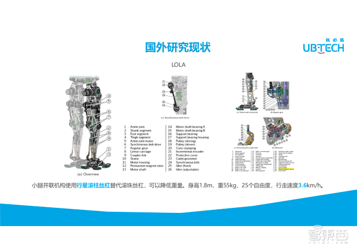 下面介绍LOLA机器人小腿踝关节部分的驱动方式,它把整个电机放在了大腿的上端,在上图序号5对应的位置,然后通过一个带传动传到膝盖的位置,接着往下传,通过一个行星滚柱丝杠的机构,它用这种传送方式代替传统的那种滚珠丝杠,这种方式比传统的方式重量会更轻。这样他把小腿脚踝的关节驱动器移到大腿上,膝盖也移到大腿。整个腿的重量比较轻,然后转动量也比较小。这个机器人最快的行驶速度是3.6km/h。