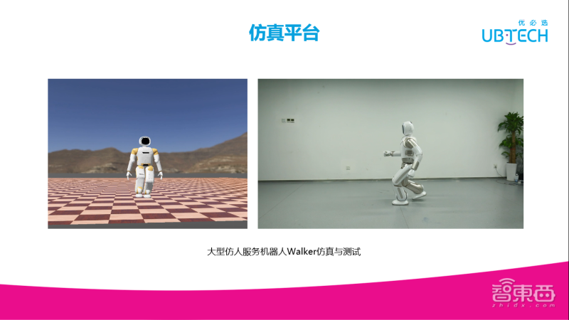 上图左部分是在仿真环境Walker走路的视频,在仿真环境里,我们的运动算法和机器人上的算法是一样的。右边是在真机上面的测试,可以看出两个的区别是手臂仿真是没有动的,但腿部的整个步态是一样的。同时,我们也会对整个仿真和真机上的一些关节力矩的曲线去比较,仿真会更好的指导做一些设计和测试。