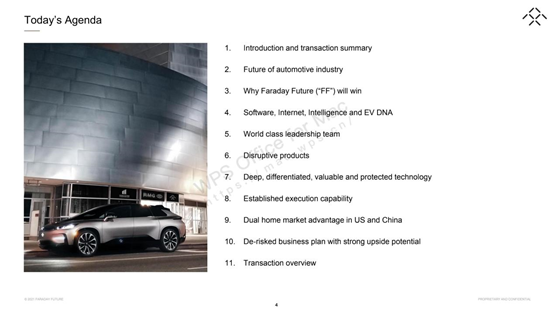 第四页:整份PPT的框架,包括本次FF借壳上市概述,汽车业的未来,为什么FF会是赢家,FF的软件、互联网、智能和电动基因,世界级的管理团队,颠覆性的产品,与众不同的技术,杰出的执行能力,中美两地的主场优势,广阔的商业前景,交易后公司的前景。