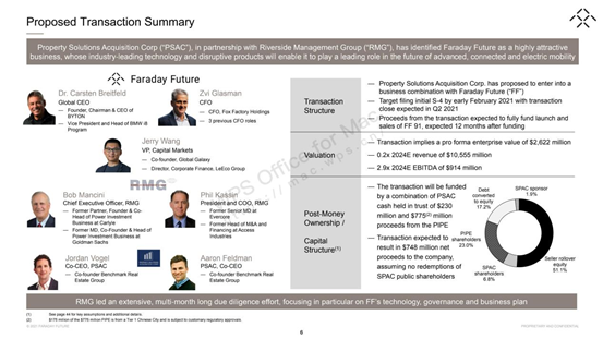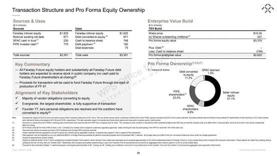 第四十三页:具体条款,包括借壳公司为纳斯达克上市企业Property SolutionsAcquisition Corp. (NASDAQ代码: PSAC),借壳上市将从基础投资者处获得7.75亿美元融资,以确保FF 91可以如期量产。总体估值为34亿美元,FF的原股东和债权人转股后,将持有借壳上市后新公司68%的股份。新公司董事会将会有9名成员,FF将任命2位,包括CEO毕福康,另有5-6位独立董事。