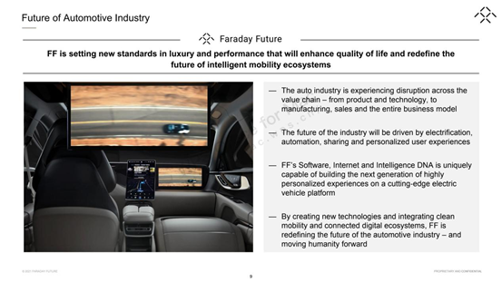 第九页:FF描述汽车业的未来:FF为汽车的豪华和驾驶重新制定标准,致力于提升生活品质,以及重新定义智能移动生态的未来。整个汽车产业链正在经历一场革命,从产品到技术,再到生产和销售,甚至整个商业模式。FF汽车的软件、互联网和智能基因,打造出了划时代的电动汽车平台。